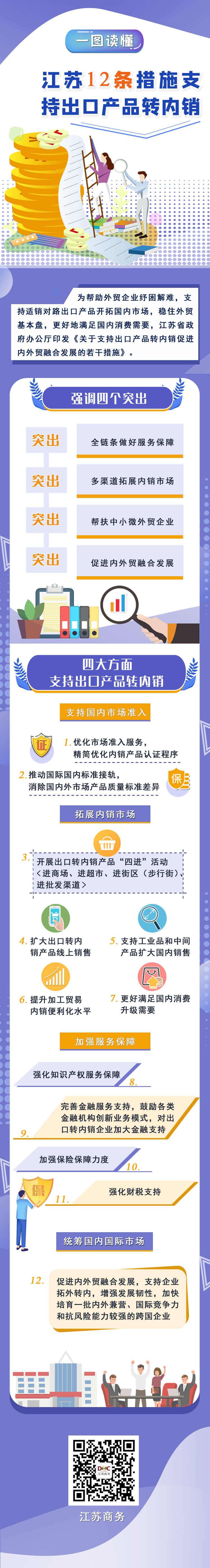 | 內容概述 | 為貫徹落實《國務院辦公廳關于支持出口產品轉內銷的實施意見》(國辦發〔2020〕16號)和省委、省政府工作部署,充分發揮政府引導作用,幫助外貿企業特別是以外銷為主、抗風險能力較弱的中小微外貿企業紓困解難,支持適銷對路出口產品開拓國內市場,促進外貿基本穩定,更好地滿足國內消費需要,現提出以下措施。 | ||||